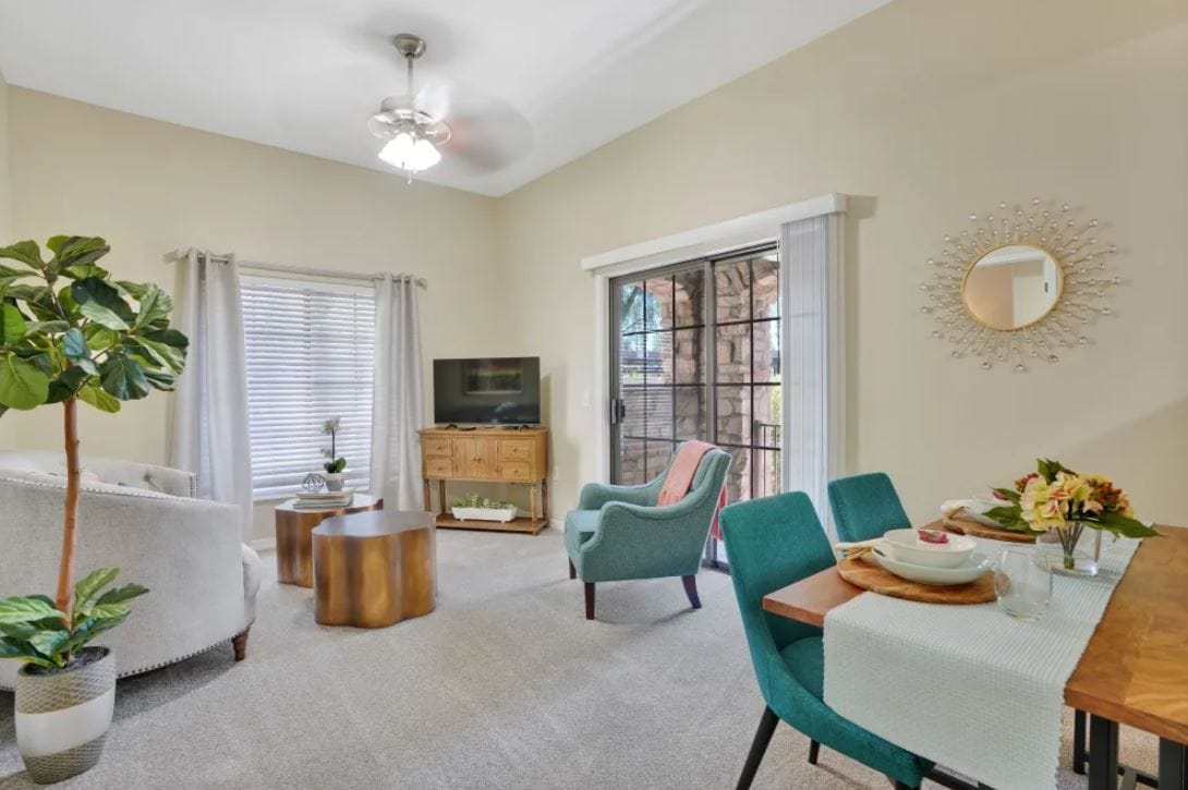 Carefree Assisted Living Center’s essential services that help residents live worry-free include transportation, meal plans, laundry, housekeeping, a dining room, lounge areas, a fireplace, a library, and 24/7 nursing care.