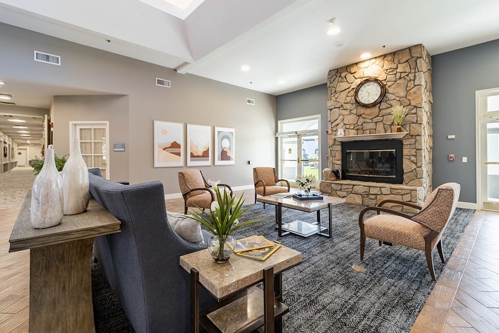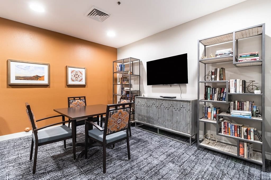 The community features ample common spaces where seniors can unwind and socialize, including concierge services for added convenience. The light palette and well-lit environment create a cozy atmosphere, ideal for reading, watching movies, or playing board games. Additionally, on-site salon services and a delightful dining experience enhance the overall positive atmosphere of the community.