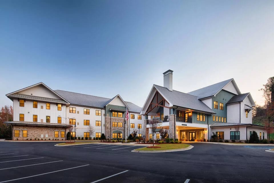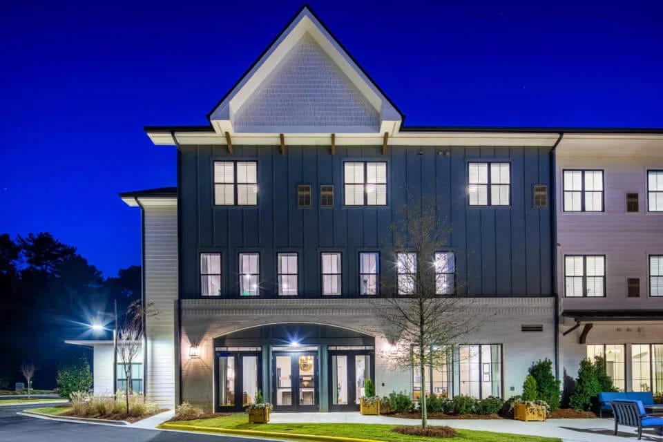 In Vestavia, Alabama, Longleaf Liberty Park is a warm and inviting senior living community situated by the serene Cahaba River. The community offers assisted living and memory care services in a contemporary farmhouse setting, creating a peaceful and comfortable atmosphere for residents. Inside the community, residents can relax in cozy seating areas and engage in activities in thoughtfully designed spaces adorned with white wood paneling and a soothing color palette.