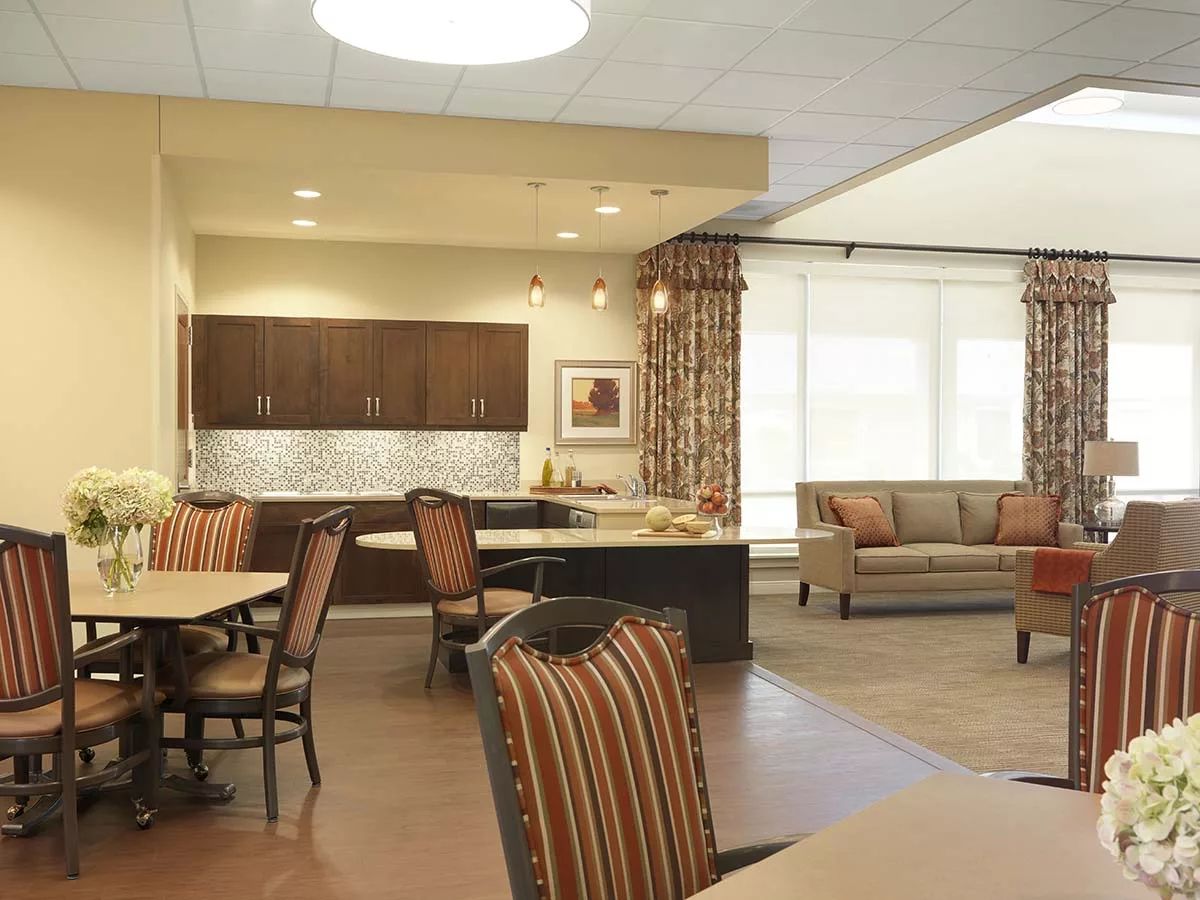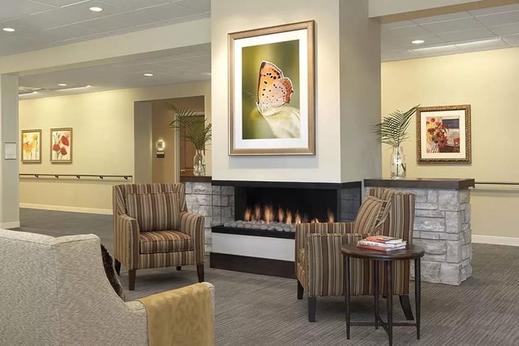 Residents enjoy private, apartment-style suites with modern amenities, including individually controlled heating and air conditioning, private bathrooms with showers and grab bars, and emergency call response systems. The community features beautifully landscaped outdoor spaces, comfortable common areas, and a variety of activity rooms to encourage social engagement and relaxation.