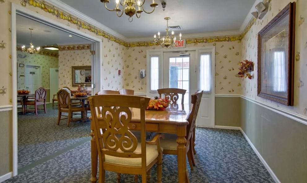 The vibrant home offers a list of services that include 24-hour nursing supervision, transportation, housekeeping, medication management, an emergency call response system in every room, and cozy outdoor and indoor common areas. Other activities include movie nights, fitness classes, a gardening club, and other scheduled social events.