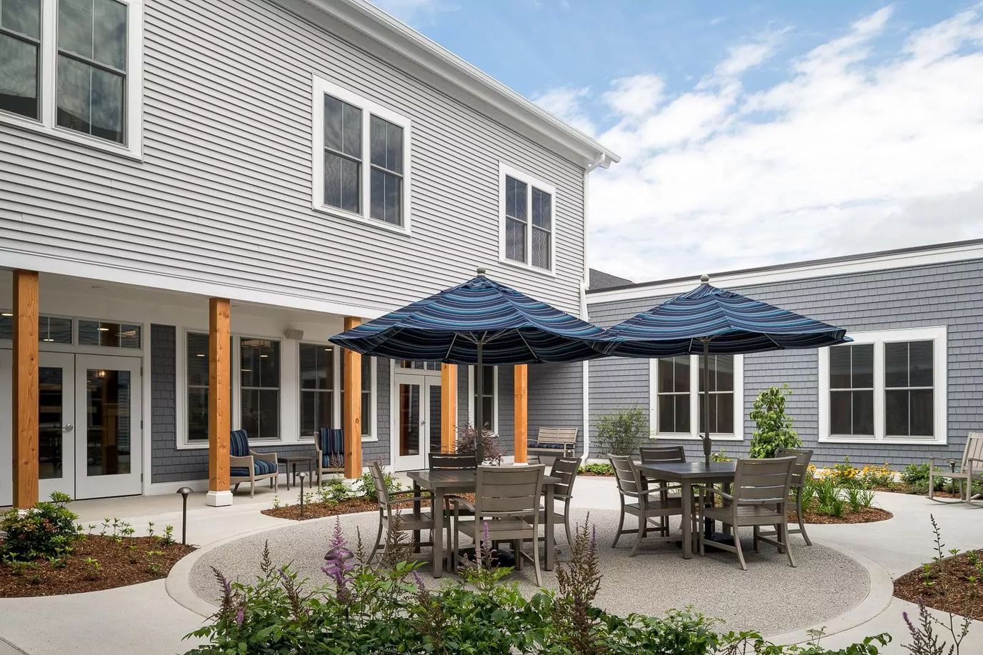 Situated on over nine pastoral acres, residents can enjoy the extensive landscaping and grounds from the veranda, one of four patios or on their private patio. Designed to promote the feel of an upscale New England country inn, the elegant interior is warm and bright with extensive community spaces including a hair salon, chapel, lounge, great room, library, card and activity rooms, private dining room and a real movie theatre!
