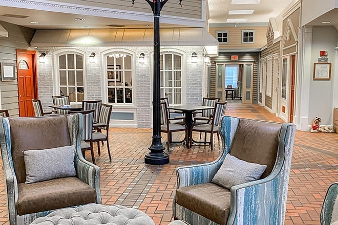 Brookdale North Oaks features a secure setting with 24/7 trained team, secured entries and exits, and an enclosed courtyard and garden, designed for residents’ safety and freedom to explore. The Clare Bridge Daily Path program includes six planned activities each day, fostering a sense of security and accomplishment. The community’s Town Square, an indoor replica of a small town center, and memory care environments with areas for safe engagement in household tasks, offer a stimulating and supportive atmosphere. With easy-to-navigate floor plans and soothing wall colors, residents enjoy a cozy environment where they can feel comfortable and at ease.