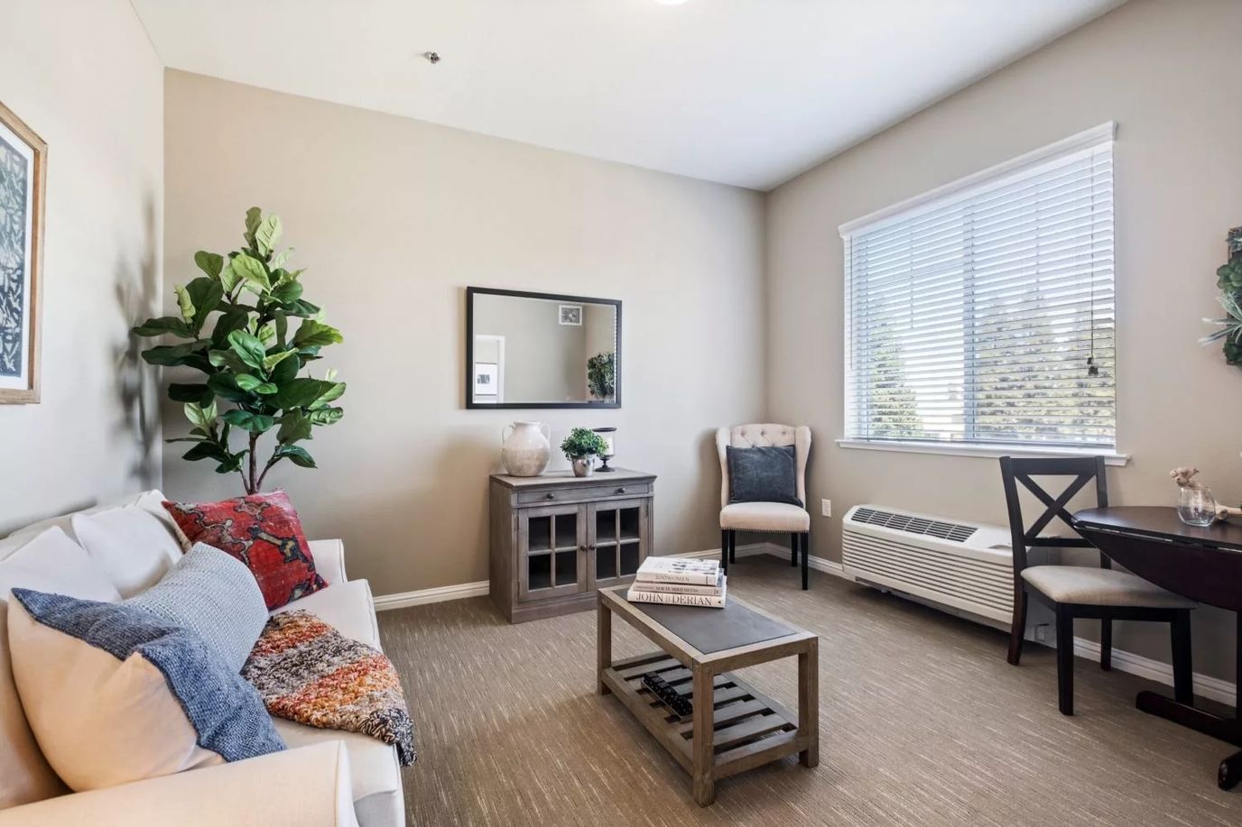 Carmel Village, is a vibrant senior living community nestled in Clovis, CA, offering a harmonious blend of assisted living, independent living, memory care services, and post-acute care. At Carmel Village, residents experience a lifestyle tailored to their needs, where compassionate and personalized 24-hour care is at the core of their well-being. The community’s dedicated staff ensures a helping hand is always within reach, providing support with daily tasks, from morning routines to medication reminders, granting residents and their families peace of mind. The apartments feature convenient kitchenettes with refrigerators and microwaves.