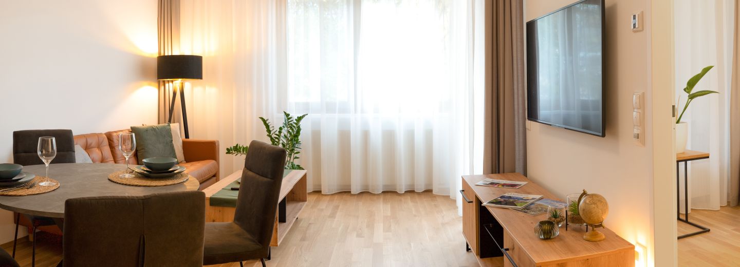 Additionally, residents have access to a cellar compartment for extra storage space. They can step out onto their terrace, which includes a small garden area, and enjoy the natural beauty that surrounds them. At Am Kurpark Retirement Oberlaa, the focus is on creating an environment that promotes well-being, independence, and a strong sense of belonging.