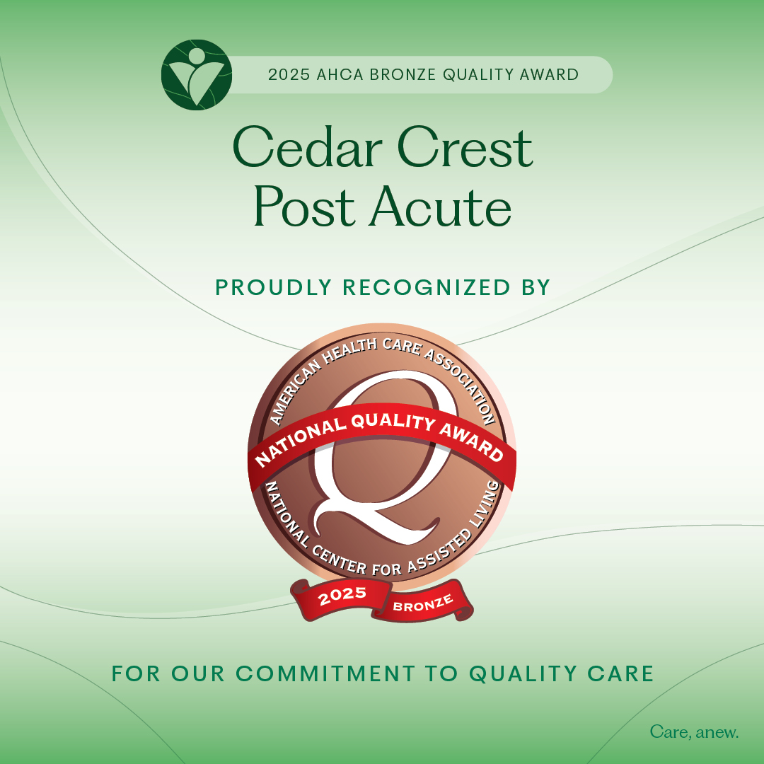 Cedar Crest assures families and seniors that nursing home care services include a patient-centered community for post-acute and long-term skilled nursing, allowing for maximum potential in recovery. They are proud to be an Urgent SNF™ and Rehabbing Care™ partner, guaranteeing a revitalizing recovery experience for all.