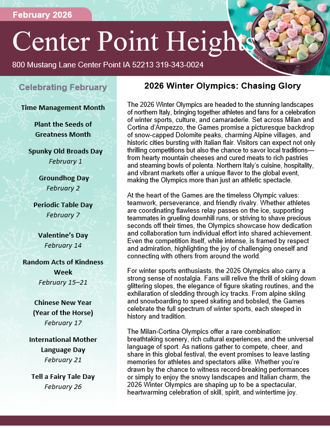 Center Point Heights is a senior living community in Center Point, Iowa. It offers independent living, assisted living, enhanced living, short stay, and respite care. Residents enjoy a maintenance-free lifestyle with access to various amenities and activities.