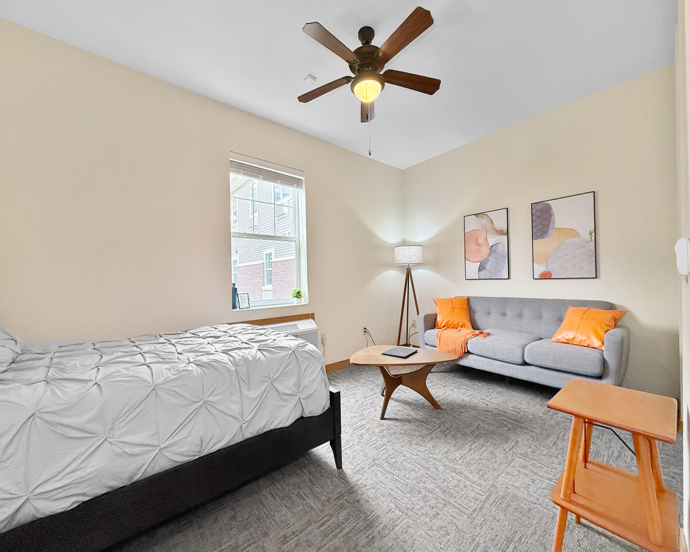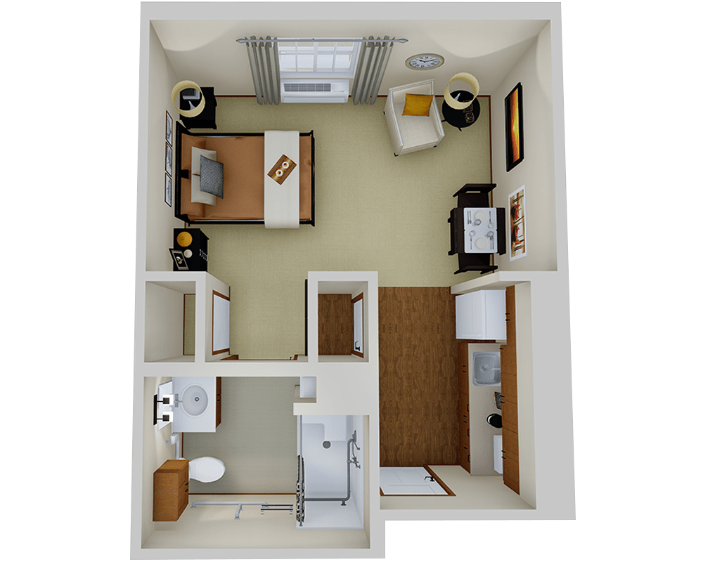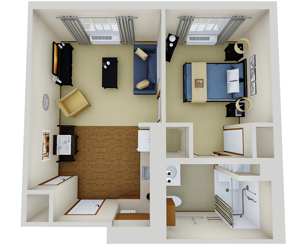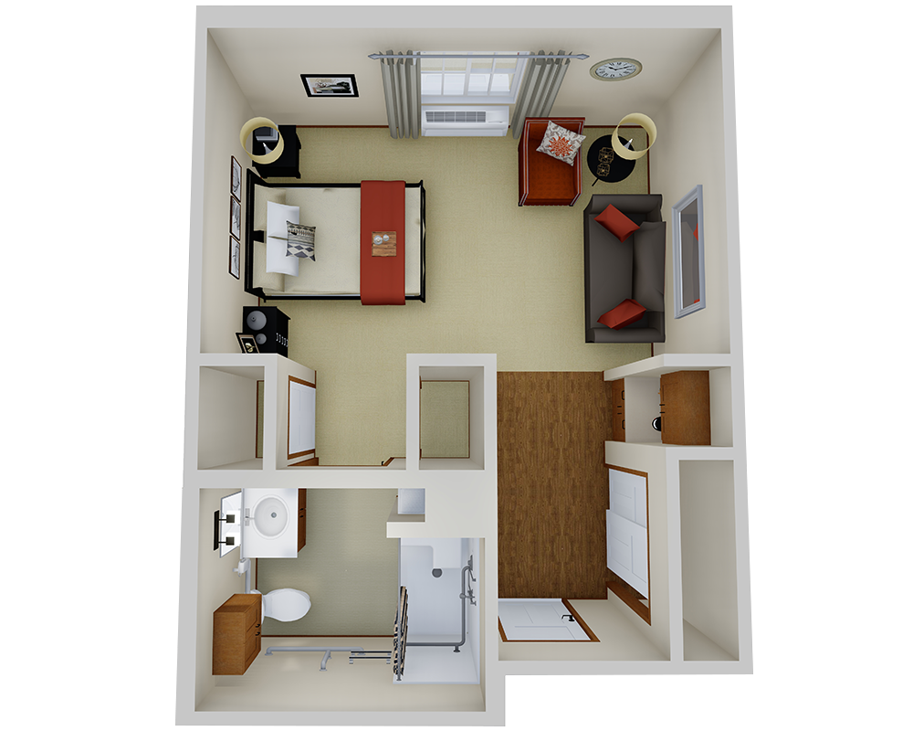 Safety Features: Walk-in showers with grab bars, personal emergency call system.