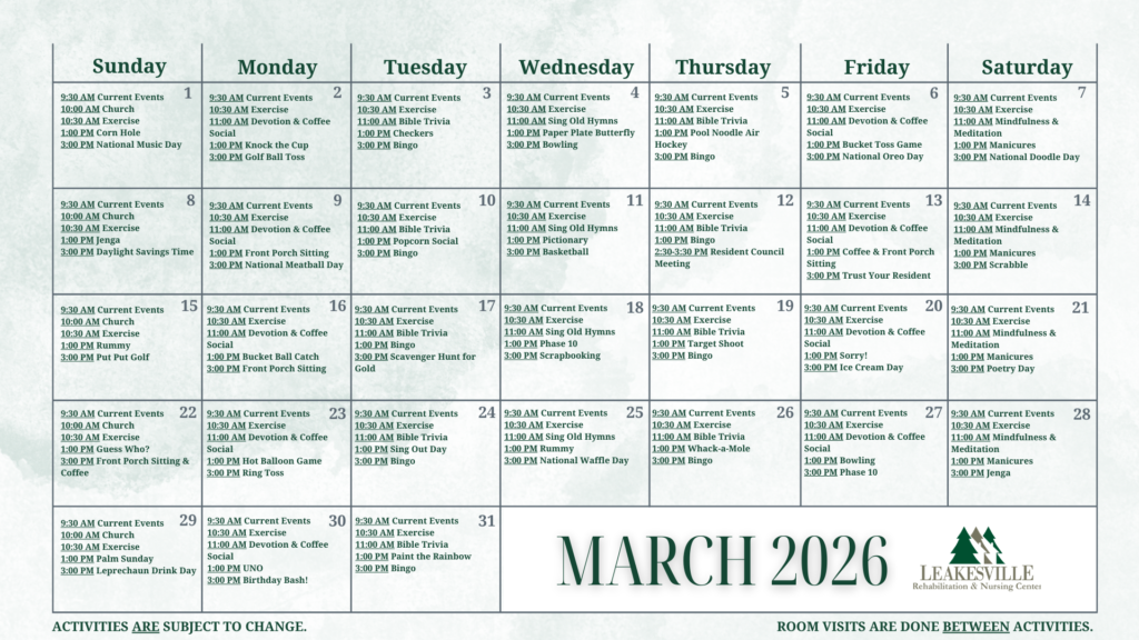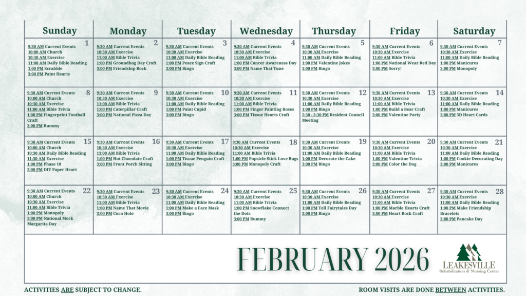 Activities and social events for residents include arts and crafts classes, social events, parties, bingo and other games, prayer services and movie nights.