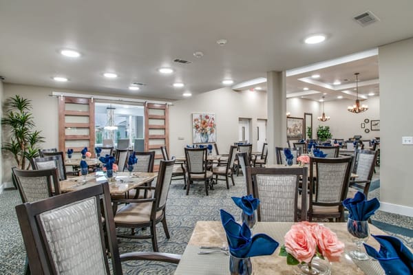 A vibrant calendar of activities, including fitness classes, wellness programs, themed events, and scheduled outings for a rewarding and fulfilling living experience. Freshly prepared meals are served restaurant-style three times a day in the private dining room or outdoor patio area, depending on residents’ moods. Various amenities, such as a salon, fitness center, theater, library, and an outdoor garden area are offered to cater to residents’ interests and various needs.