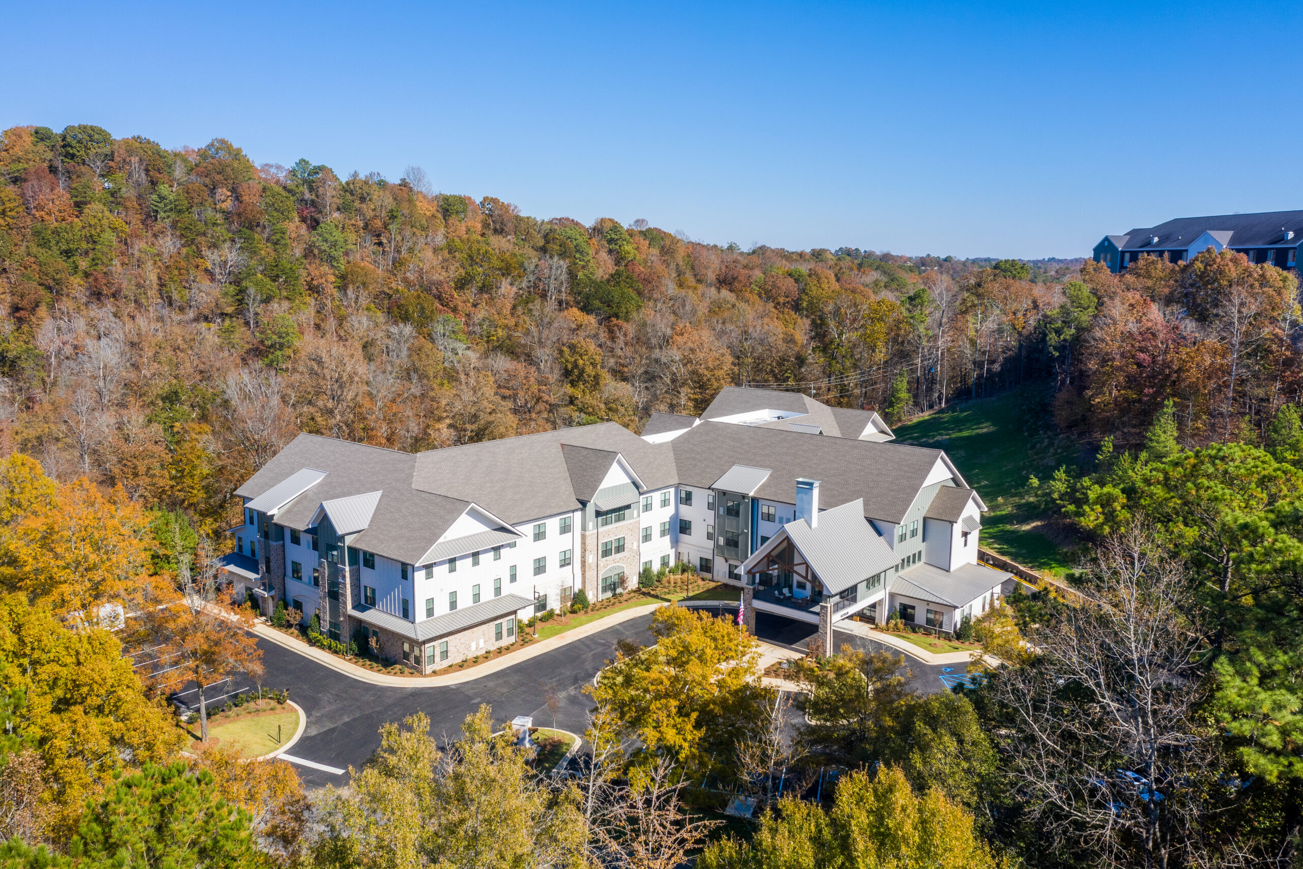 In Vestavia, Alabama, Longleaf Liberty Park is a warm and inviting senior living community situated by the serene Cahaba River. The community offers assisted living and memory care services in a contemporary farmhouse setting, creating a peaceful and comfortable atmosphere for residents. Inside the community, residents can relax in cozy seating areas and engage in activities in thoughtfully designed spaces adorned with white wood paneling and a soothing color palette.
