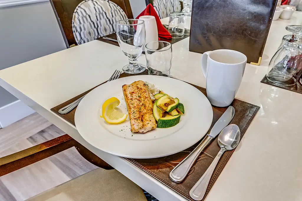 Dining room with chef-prepared meals and restaurant-style dining.