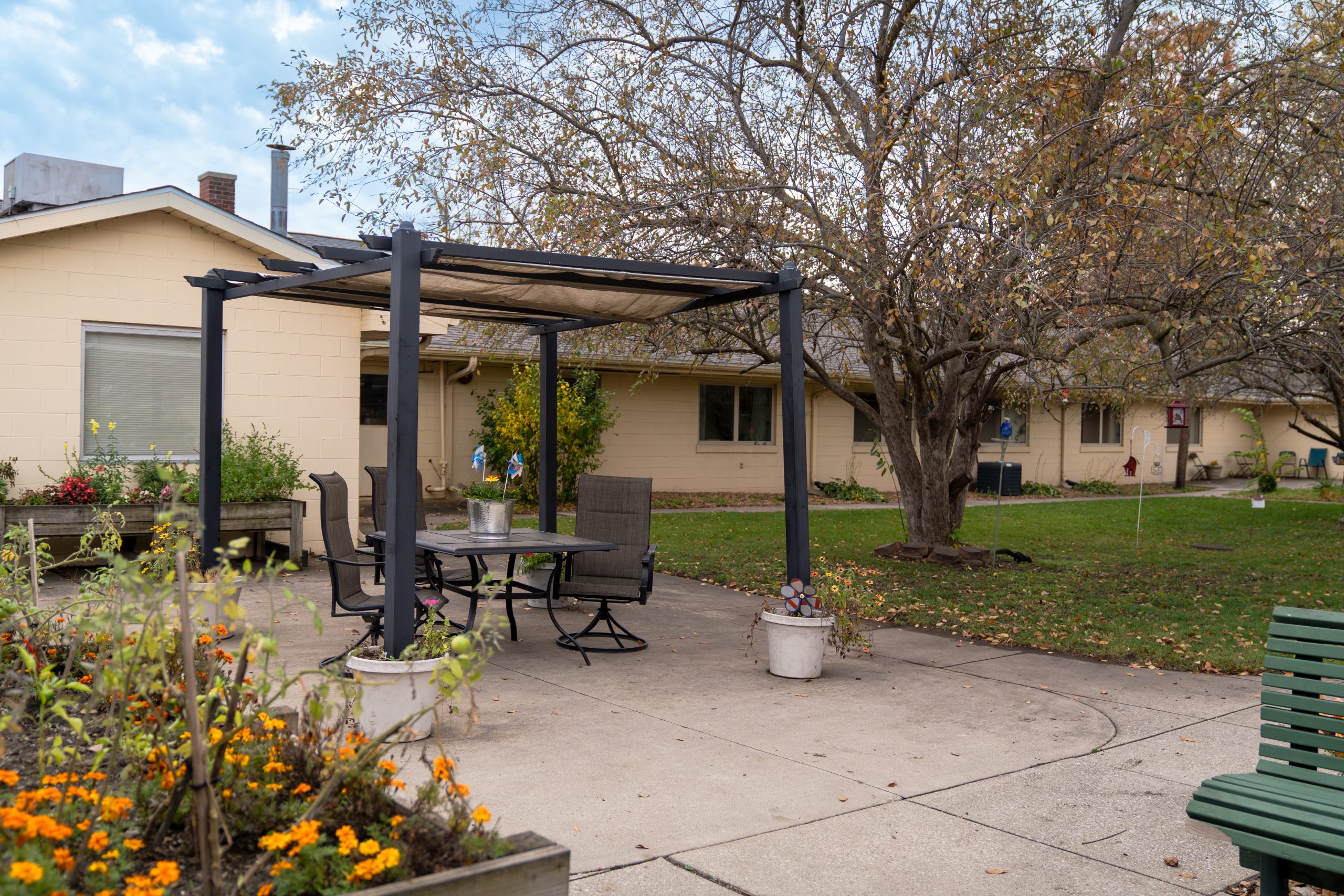 A larger shared setting that may offer more common spaces and organized community services.