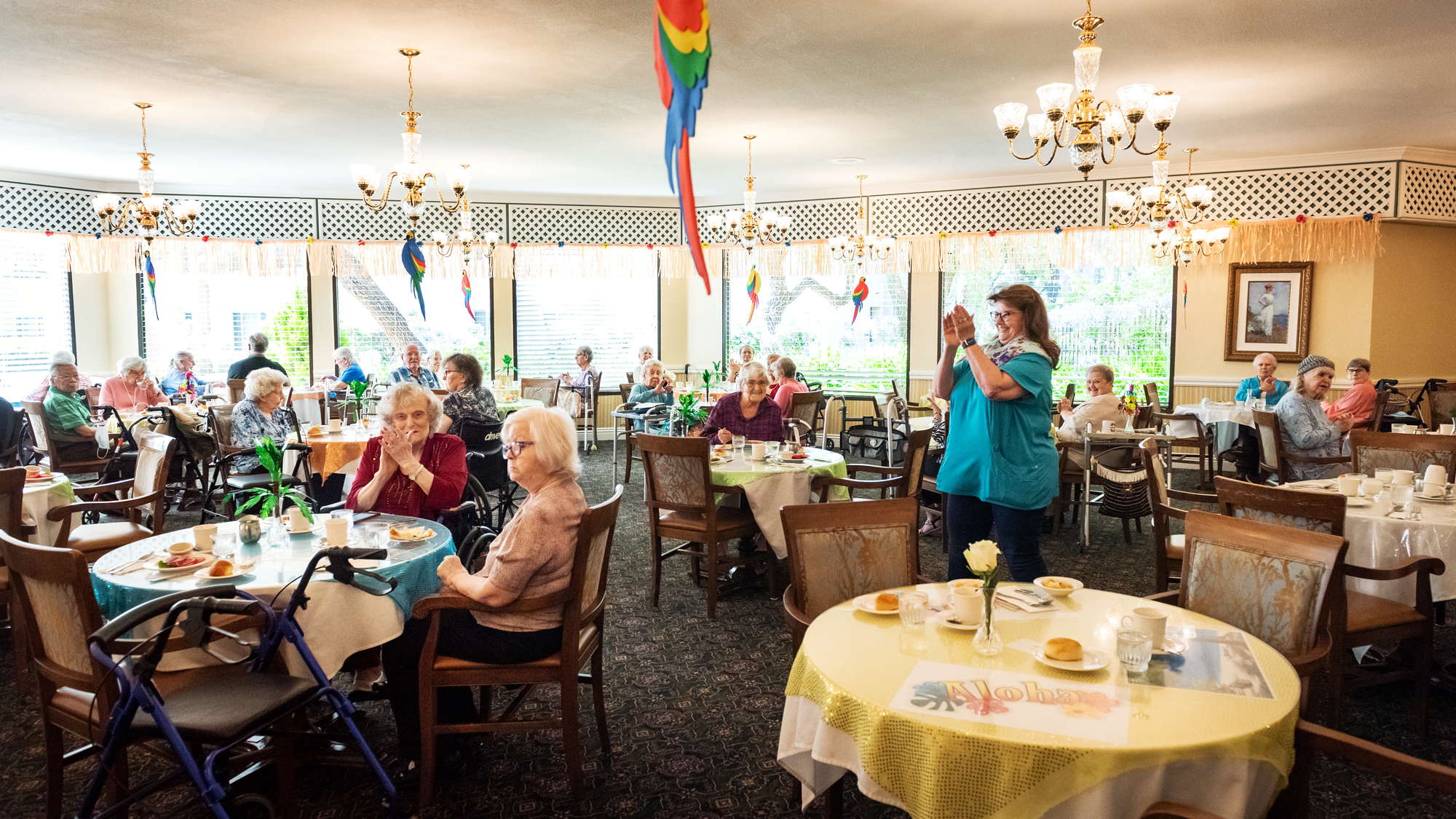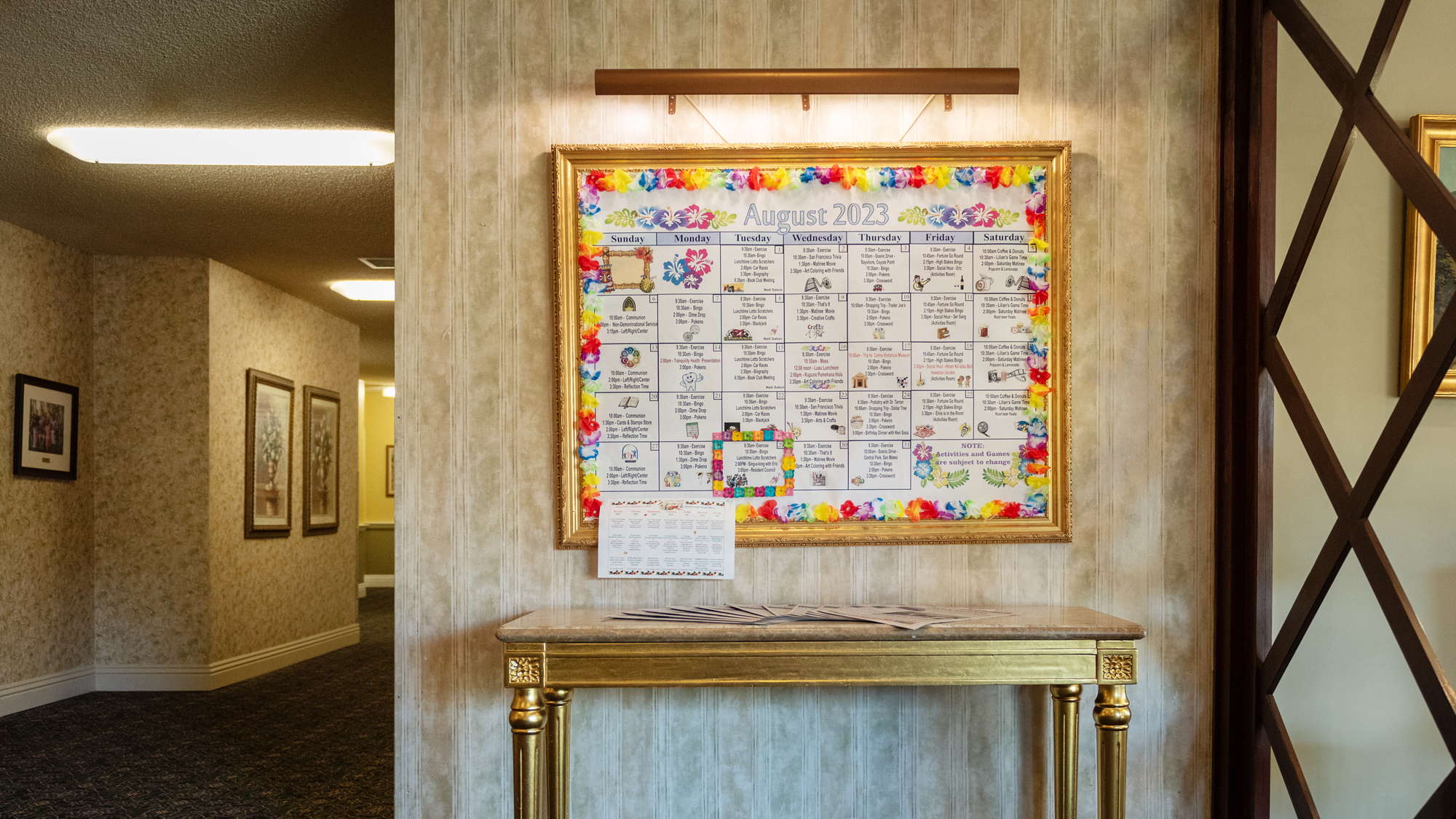 Daily activities include bingo, birthday parties, exercise, and entertainment.