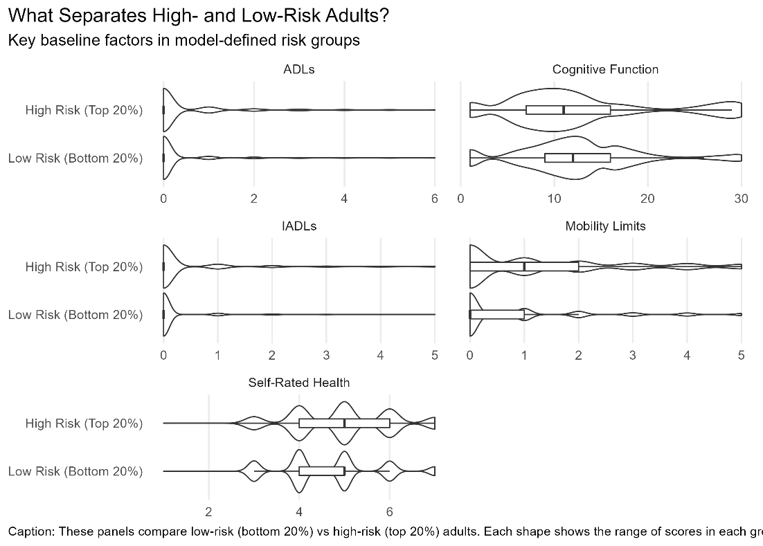 To understand who the model flags as vulnerable, we compared the 20 percent of adults with the highest predicted risk to the 20 percent with the lowest. The differences are not subtle. The high-risk group had dramatically more difficulty with daily tasks, both basic activities like bathing and dressing (ADLs) and more complex ones like shopping and managing money (IADLs). They had more mobility limitations, worse self-rated health, more depressive symptoms, and lower cognitive scores. They were also less likely to have a partner, which matters because spouses are often the first and last line of informal caregiving.