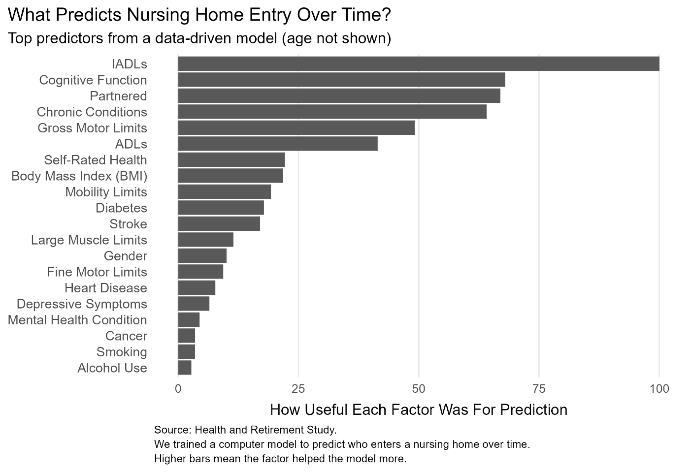 Figure 1. The factors that best predict nursing home entry over time. IADLs (instrumental activities of daily living), cognitive function, and partnership status dominated. Age is excluded from the chart because it is used to define the time scale. Source: Health and Retirement Study.