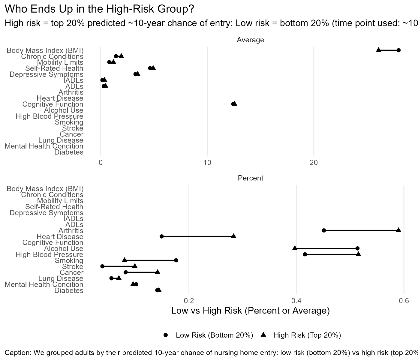 Figure 2. How high-risk and low-risk adults differ at baseline. Each row shows a characteristic; the gap between dots shows the difference between the bottom 20% (low risk) and top 20% (high risk) of predicted 10-year nursing home entry probability. Source: Health and Retirement Study.